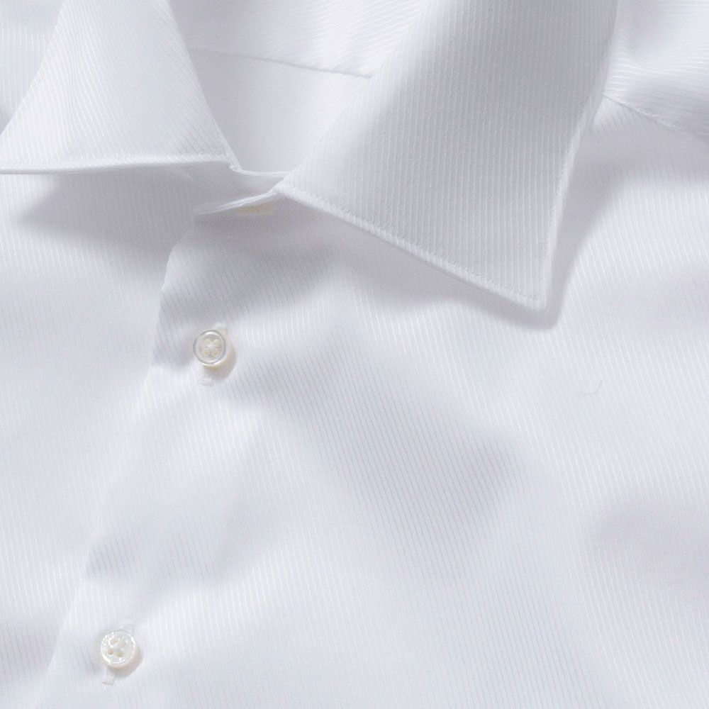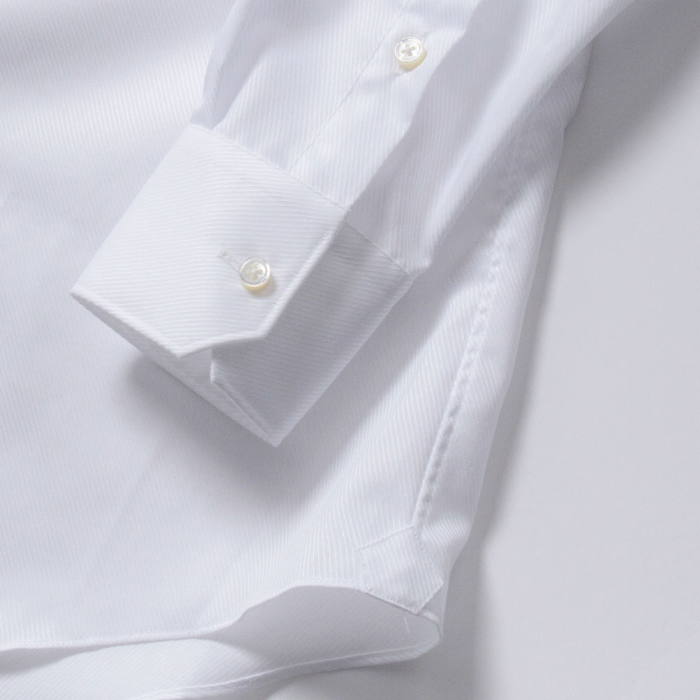 裾:テールドボトム (ガセット付き) [¥550] 縫製仕様:袖付:巻伏本縫、脇縫:巻伏本縫 [¥1,100] 運針:選択あり (19~21針) [¥550] ボタン:白蝶貝 (貝ボタン/10mm幅4mm厚) [¥1,650]おすすめのパーツは、ご希望に合わせてオーダー内容の確認画面で変更することができます。   【MT47】 120/2 ドビーストライプ (ホワイト)