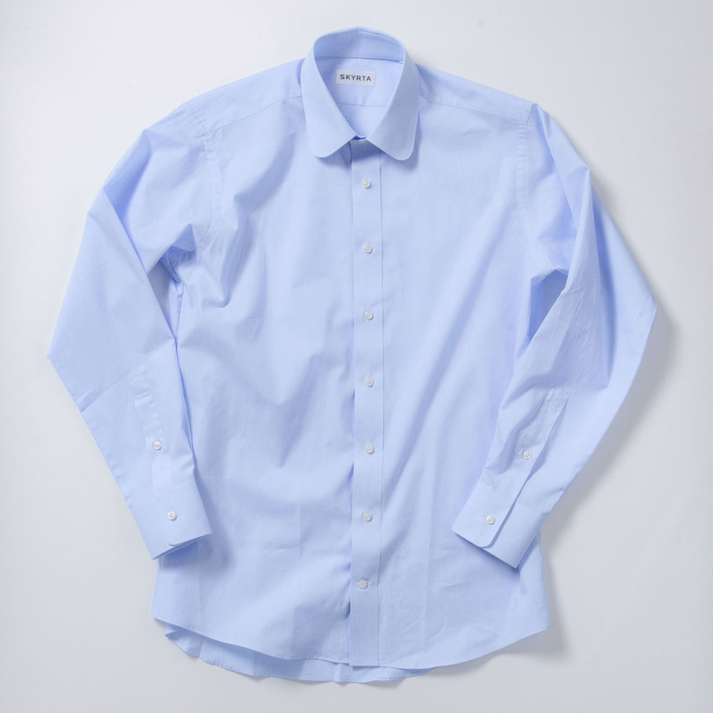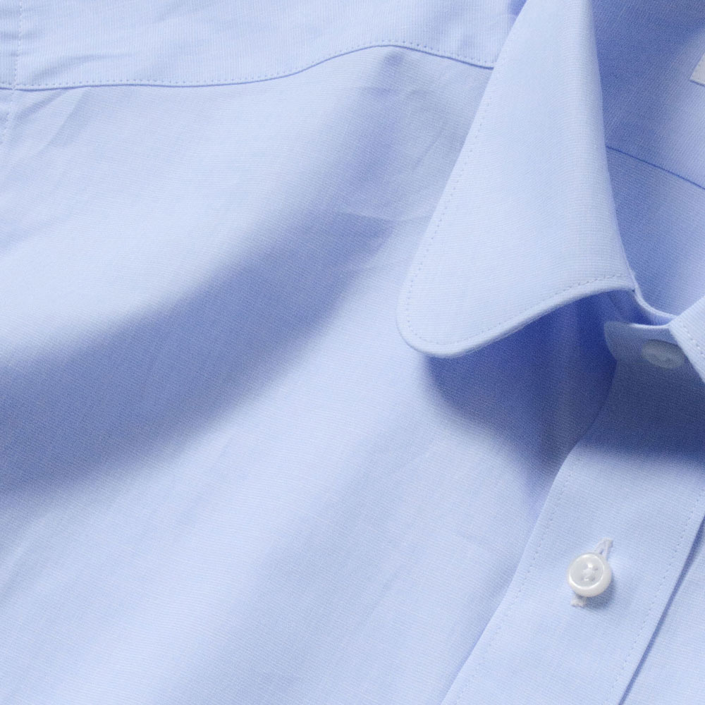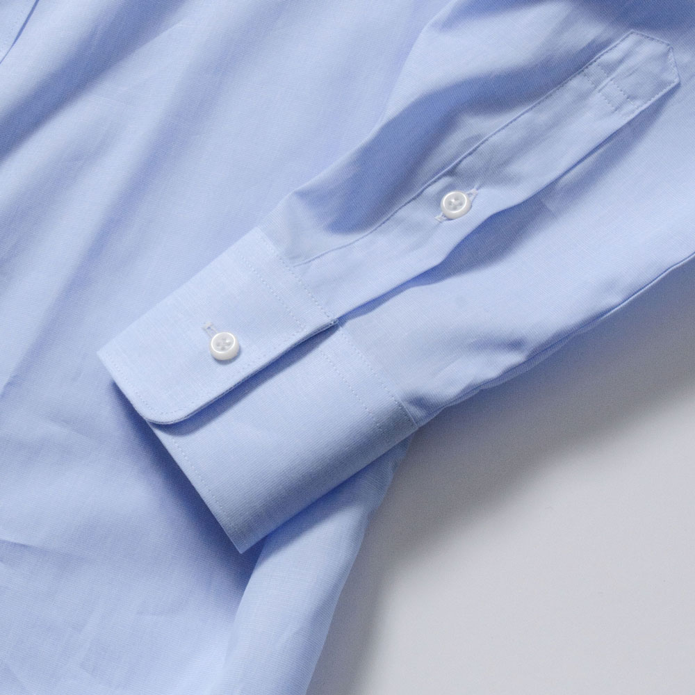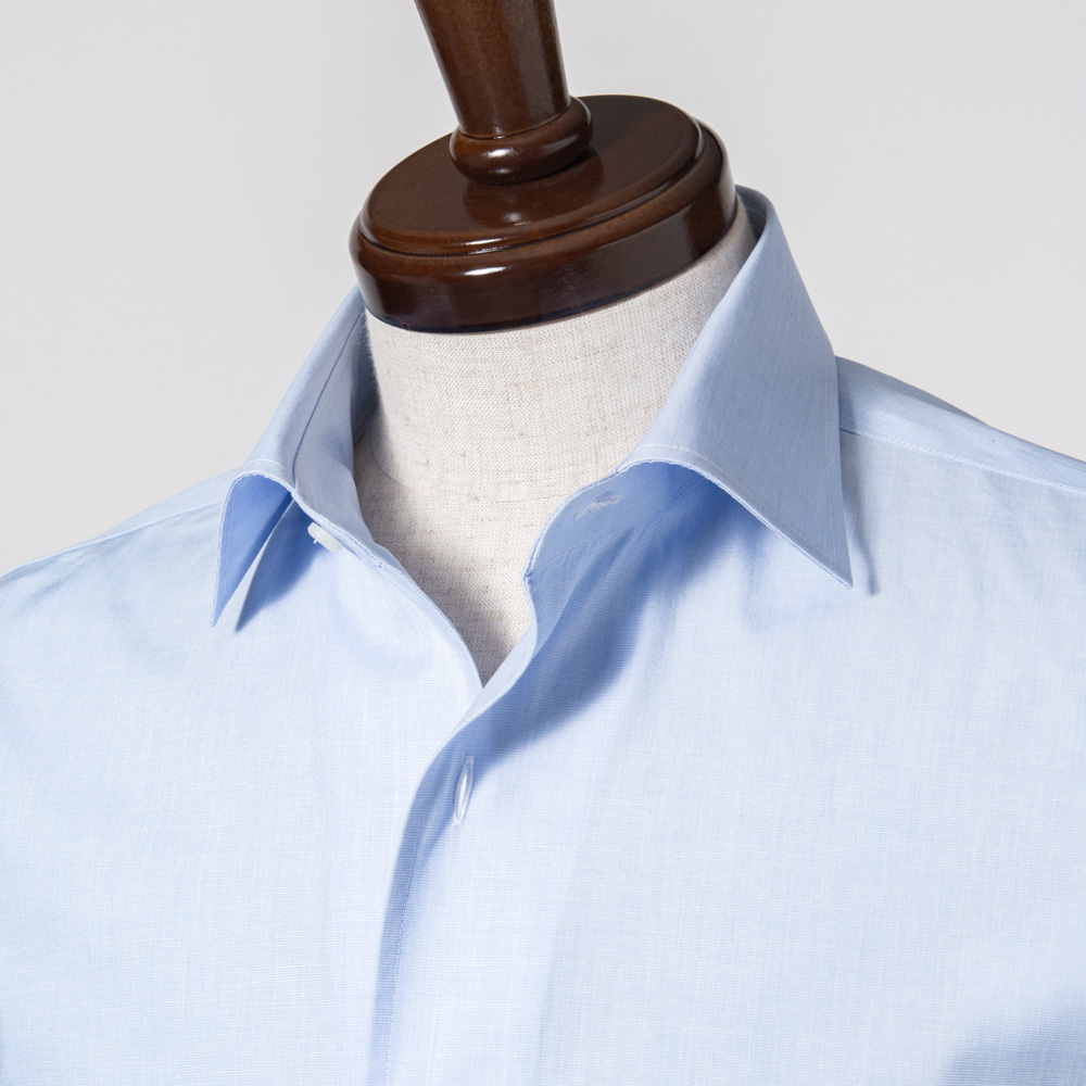 ハーフワンピースワイドイタリア由来のノータイ専用の衿型を、日本のTPOに合わせてモディファイした「ハーフワンピースワイド」。 ボタンを外した際の美しさはもちろんのこと、タイドアップスタイルにも対応できるのは嬉しいポイント。 スマートでエレガントな「大丸 (7cm)」のカフスも、芯地を柔らかくしたことで、どこかこなれた印象に。 こういう微差を楽しむ仕様なら、生地は表情があるものと組み合わせたい。 商品ラインナップ   【2U55】 エンドオンエンド (サックス)