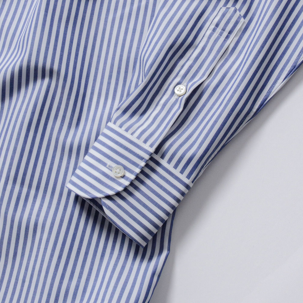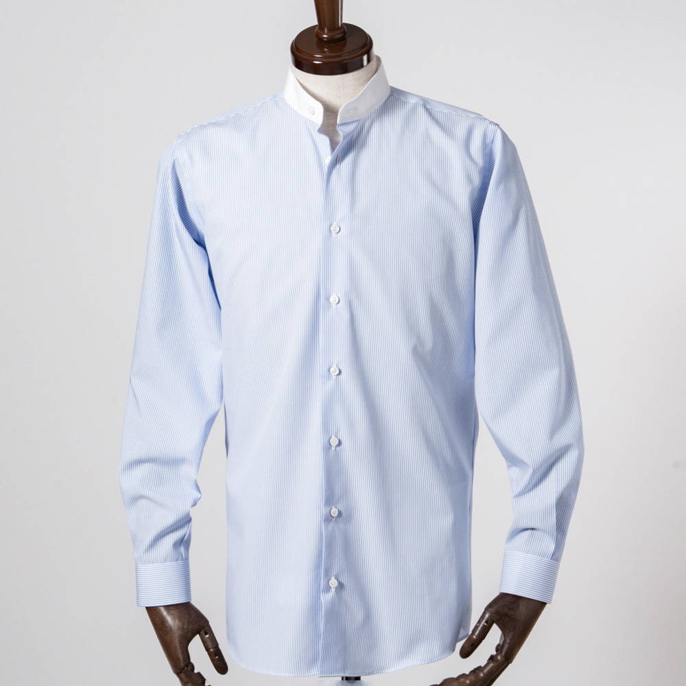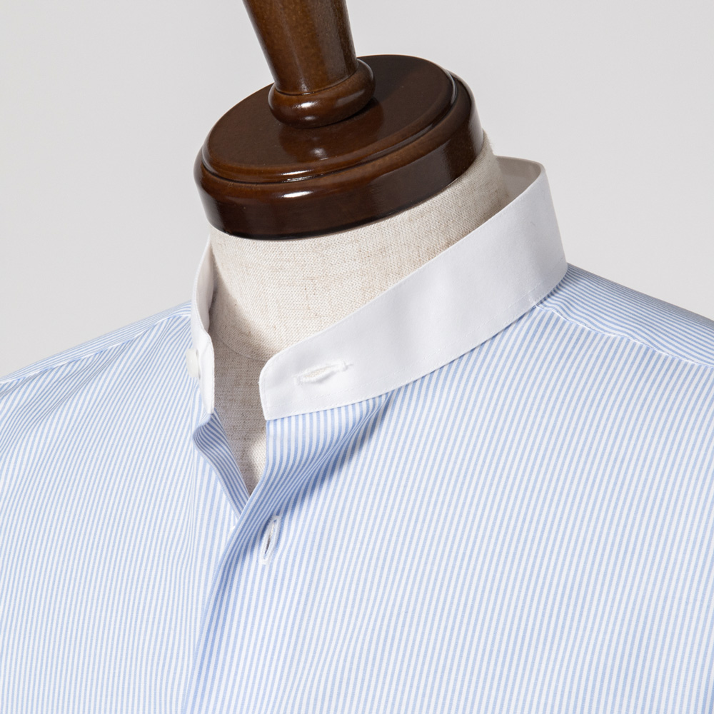 スタンドカラーウォール街のエリートを彷彿させるクレリックシャツを、ノーネクタイ用のシャツにカスタマイズしても面白い。 「スタンド」の衿型と「スクエア (5cm)」のカフス、別生地は「衿のみ」にするとグッと柔和な趣に。 クレリックシャツ特有の清潔感のある爽やかな印象はそのままに、ドレッシーとカジュアルさの両立が図ることができる。 仕様に遊び心が詰まっているからこそ、生地選びはゴードン・ゲッコーよろしくブロックストライプあたりが王道だろう。 商品ラインナップ   【2U24】 ブロード ブロックストライプ (ホワイト×サックス)