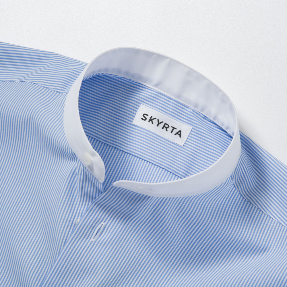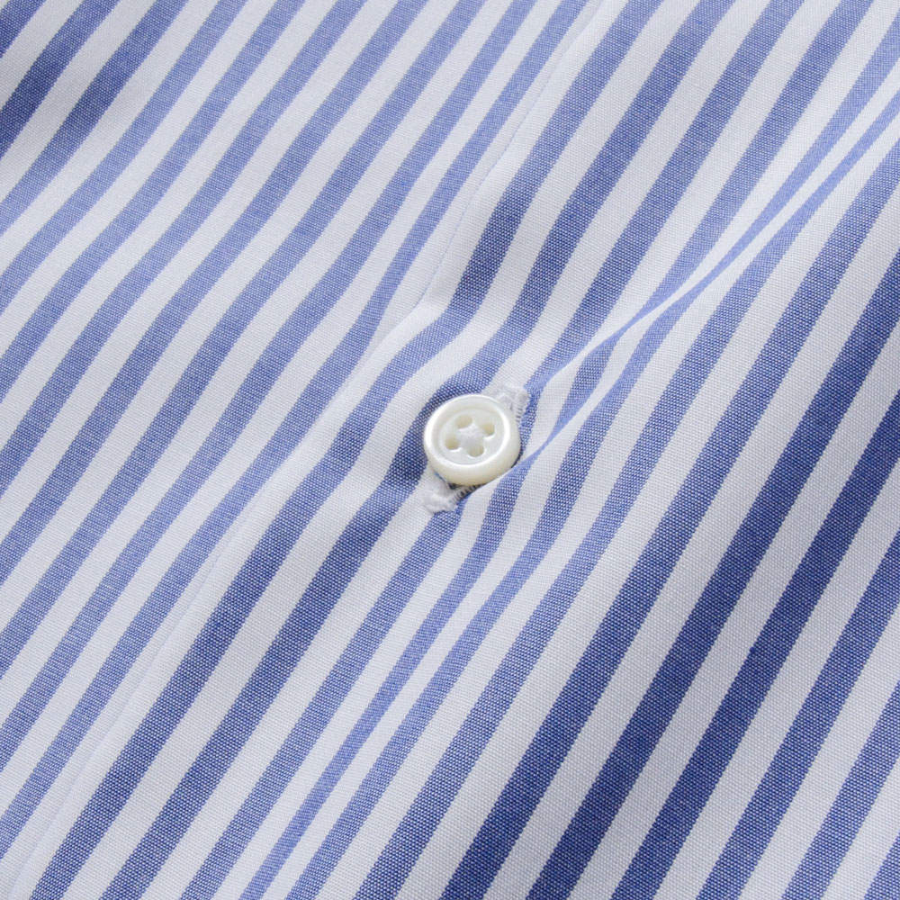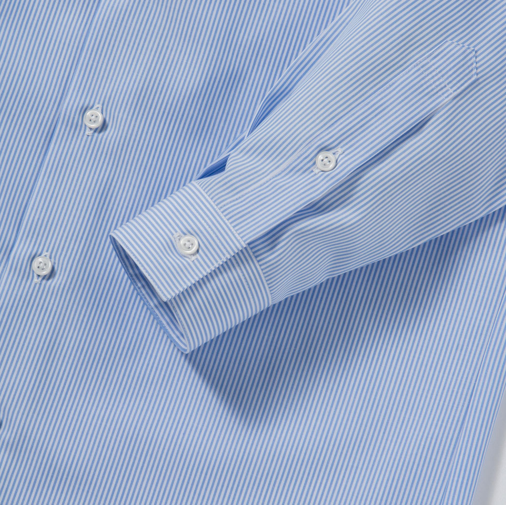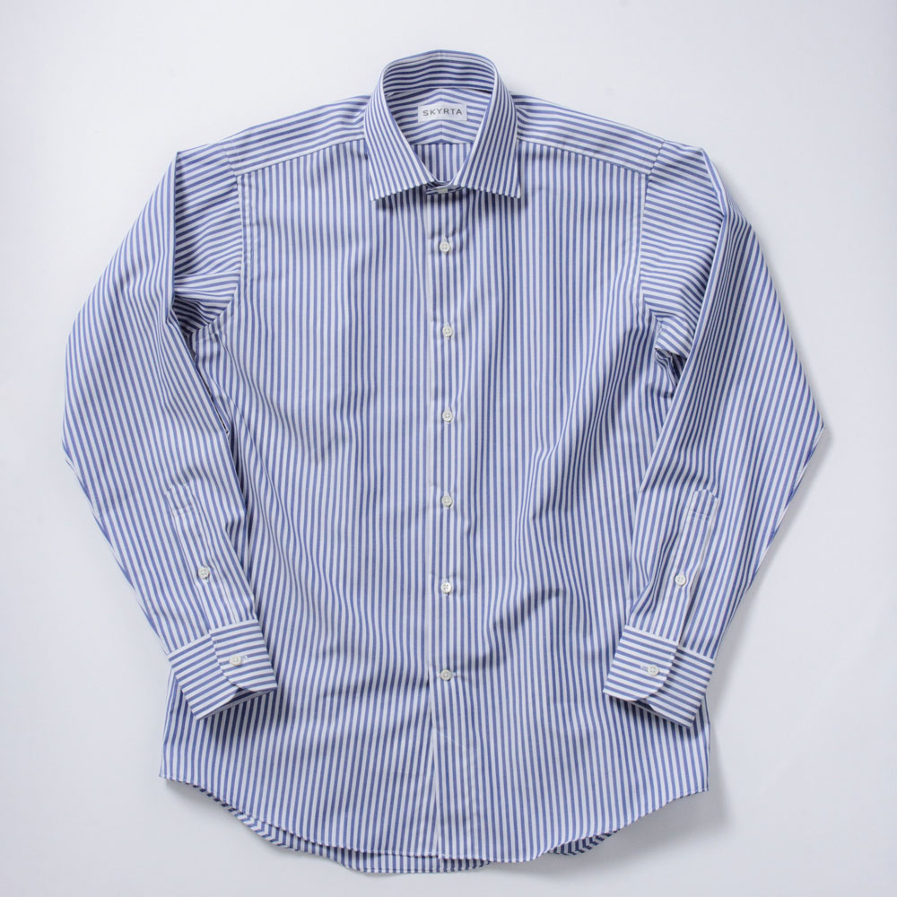 スタンドカラーウォール街のエリートを彷彿させるクレリックシャツを、ノーネクタイ用のシャツにカスタマイズしても面白い。 「スタンド」の衿型と「スクエア (5cm)」のカフス、別生地は「衿のみ」にするとグッと柔和な趣に。 クレリックシャツ特有の清潔感のある爽やかな印象はそのままに、ドレッシーとカジュアルさの両立が図ることができる。 仕様に遊び心が詰まっているからこそ、生地選びはゴードン・ゲッコーよろしくブロックストライプあたりが王道だろう。 商品ラインナップ   【2U24】 ブロード ブロックストライプ (ホワイト×サックス)