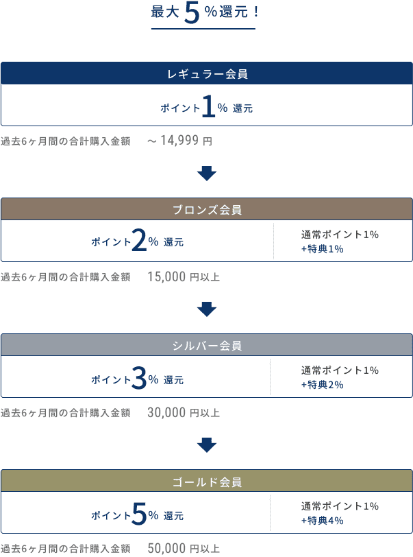 会員ランク累計ご購入金額に応じてランクが上がり最大5%のポイントを還元。